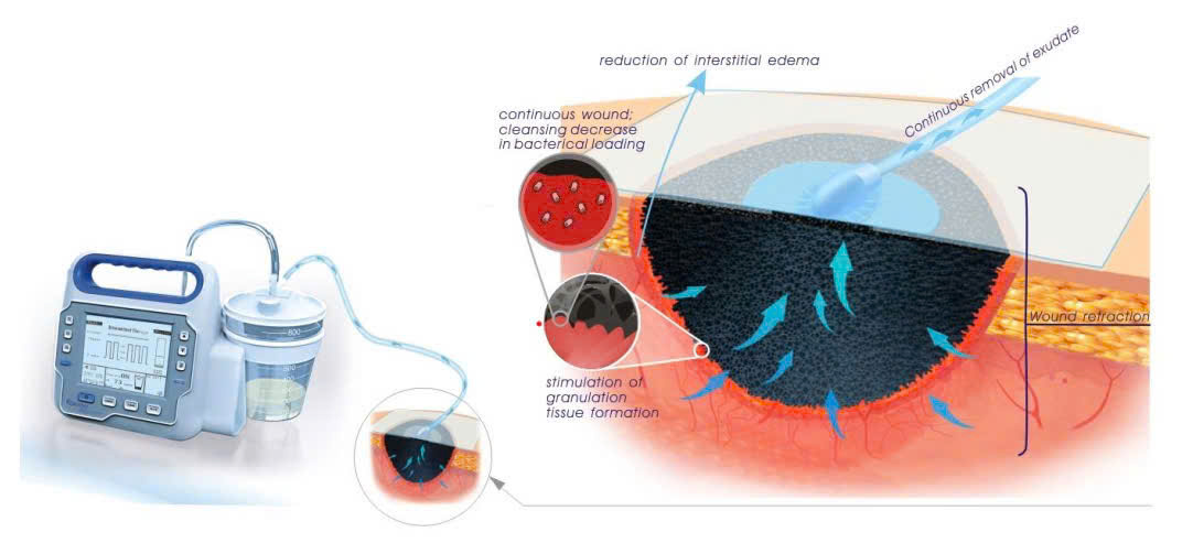 Áp suất âm ở bình chứa dịch tạo lực hút truyền qua ống dẫn và mảnh foam (gạc xốp có rất nhiều lỗ nhỏ chuyên dụng) làm từ vật liệu đặc biệt được đặt vừa khít trong vết thương sẽ tác động tới toàn bộ bề mặt của vết thương đã được bịt kín. Dưới tác dụng của lực hút này (thường dùng là 75 – 125 mmHg), dịch ứ đọng và những mảnh tổ chức hoại tử nhỏ trong vết thương cũng như dịch phù nề ở tổ chức xung quanh vết thương được hút qua các lỗ của foam để gom vào ống dẫn và đổ vào bình chứa dịch có áp suất âm.