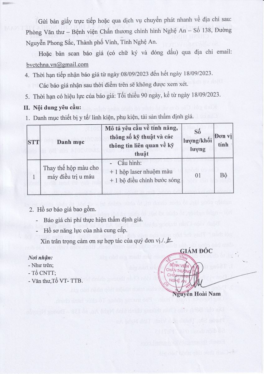 Bệnh viện Chấn thương - Chỉnh hình Nghệ An thông báo mời chào giá dịch vụ thẩm định giá cho gói thầu "thay thế hộp màu cho máy điều trị u máu tại Bệnh viện năm 2023" như sau:
